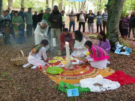 En mitad del frío, parece que la unidad fuera más sentida. En mitad de la arboleda inmensa, todos arrejuntados en torno al altar, todos/as compenetrados/as en unas mismas oraciones, en unos mismos cantos, pareciera que pudiéramos rozar algo de la gloria y el gozo de las Alturas. Los cuerpos en algunos momentos estrechamente enlazados, cerrando el paso al aire de la montaña nos hacían sentir el “Somos Uno” en toda su poderosa y mágica literalidad. Floreció así pues el “lauburu”, símbolo solar y ancestral de la fraternidad entre el musgo y la infinitud de las hojas caídas, floreció la dicha de sentirnos profundamente hermanados en medio de un paraje sobrecogedor.