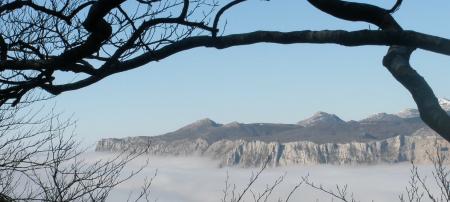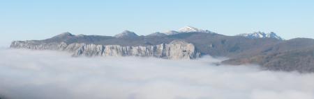 En medio de las mil y un curvas cuesta abajo me debatía también en la duda de compartir o no tamaña vivencia. Guardar dentro aquellas grandes aves y su vuelo majestuoso o compartir el testimonio, compartir el convencimiento de que la vida se alarga tras nuestra torpe vista, que el velo con la otra Realidad es cada día más fino. ¡El Cielo me perdone si erré al mentar ese planear tan cercano, al compartir ese guiño de los gigantes alados, allí arriba en la gloria de las cumbres de una Urbasa, aquella mañana, especialmente soleada y bendecida! * En esos segundos de arrobamiento, lo último que se me ocurriría sería buscar la cámara en el macuto. Queden eso sí las fotos del mar de nubes para acompañar el relato. |