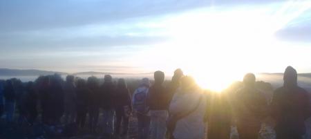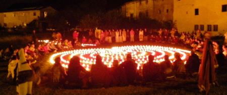 Pero el momento solemne llegó cuando las hermanas de la Arboleda anclaron su laberinto solar en la noche del sábado. Los centenares de cirios nos hicieron olvidar si caminábamos la tierra o nos habían dado ya pase a otras superiores geografías. No supimos por dónde dimos vueltas, dónde nos buscábamos. Quizás deambulamos por la plaza de Artaza, quizás hollamos un césped que ya no era de este mundo. El grupo Sarva y sus suaves mantrams terminaron de soltar las últimas amarras que, junto a aquella sobrecogedora luminaria, aún nos ataban a la tierra. De suerte que en último momento descargó la tormenta. El agua que había aguantado durante todo el fin de semana se volcó justo tras el cierre de la ceremonia del domingo por la tarde. De suerte que cayó aquel diluvio, por que sino quién hubiera abandonado aquel círculo, aquella piña de centenar y medio de almas. De suerte que nos alcanzó el fuerte chaparrón, porque sino quién hubiera encendido los motores, quién hubiera puesto rumbo a su destino, tras vivir tan intensamente ese Otro Destino, ése que tejemos unidos/as cuando llama el Sol, cuando nuestros corazones se entregan por entero. Si es voluntad del Cielo, volveremos juntos/as al Sol, con bufanda al cuello y manta a la espalda, con nuevos cantos en los labios, con nuevos hermanos a nuestra vera. Volveremos al cortado majestuoso, cuando el verde enseñoreado, allí al rayar la alborada, allí de nuevo enmudecidos por la belleza infinita, allí a renovar juntos la nueva, la eterna hermandad. |