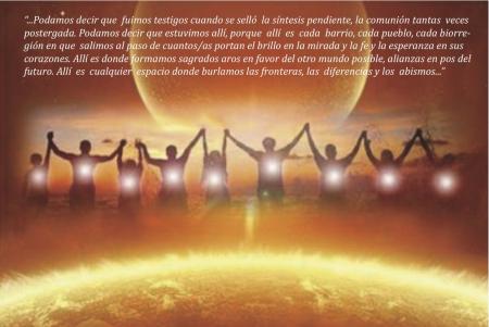 Estuvimos cantando y rezando hasta el amanecer y con las primeras luces del alba sellamos un pacto sagrado, una alianza que saltaría montañas y valles, mares y océanos, que trascendería el tiempo y las geografía, las generaciones y los tiempos. Sellamos una alianza eterna y allí estaban los Guías de todos las edades, las Grandes Almas, las que nosotros consideramos separadas y en realidad eran todas juntas la más sólida de las piñas. Eran las que siempre nos estuvieron acompañando e iluminando, las que culminaron el Camino, las que pudieron haber volado y sin embargo se quedaron con nosotros y nosotras. Allí estaban para bendecir aquella alianza tan aguardada, escrita en lo profundo de tantos corazones. Podamos decir que fuimos testigos cuando se selló la síntesis pendiente, la comunión tantas veces postergada. Podamos decir que estuvimos allí, porque allí es cada barrio, cada pueblo, cada biorregión en que salimos al paso de cuantos/as portan el brillo en la mirada y la fe y la esperanza en sus corazones. Allí es donde formamos sagrados aros en favor del otro mundo posible, alianzas en pos del futuro. Allí es cualquier espacio donde burlamos las fronteras, las diferencias y los abismos. Allí es donde se acaricia el mañana, donde se cuidan las nieves del ártico y las cosechas de espelta y cebada de las próximas generaciones. Allí es cualquier lugar donde se fragua el más elevado de los sueños de todos los tiempos y geografía, el sueño de la fraternidad humana, en unión con nuestros Guías, en unión con los benditos reinos animal, vegetal y mineral. Podamos decir que estuvimos allí, cuando salimos de nuestras cuitas personales y nos unimos a la corriente de servicio sin marca, sin color, sin siglas. Cuando nos unimos al Plan Uno, al Trabajo Uno, a la Urgencia Una…; cuando olvidamos nuestras diferencias, sacrificamos nuestros egos y nos entregamos por entero a la Causa sin nombre ni tiempo, a la Unidad consagrada en toda su diversidad ¿Cuándo sino ahora? ¿ Cómo sino unidos? Bendito sea, a pesar de todos los “peros”, de toda las noches y sus hierros y amenazas, este tiempo tan aguardado, tan privilegiado, en que por fin nos reunimos todas las familias de la Aurora. |