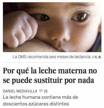 No sólo la bendita leche materna, no sólo ese néctar sin par con más de doscientos azúcares... No sólo el blanco licor de la suprema e inigualable ternura, en realidad ningún alimento natural se puede sustituir, ni emular y es bueno que reparemos en ello. Es así como vendrá la rendición, es así como nos alcanzará el agradecimiento desbordado. Reconocer la palidez de nuestras imitaciones ya es un gran paso. Ya hemos jugado a dioses más de la hora. Toca alejarnos de la errada tecla del "copy-paste". No sólo la leche y los alimentos, en realidad nada que Dios y su infinita cohorte de devas y elementales haya creado, puede ser sustituido y a nosotros nos corresponde contribuir humildemente a ensalzar esa Creación, a cantarla, a protegerla, nunca a dañarla. Hoy es portada en "El País" que la sabiduría de la Creación es infinita, mañana sea también primera plana que respetaremos por siempre esa Creación, que seremos con Ella, que la cuidaremos y glorificaremos por los siglos y los siglos. |