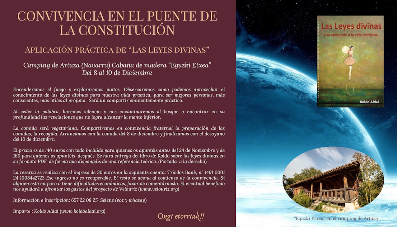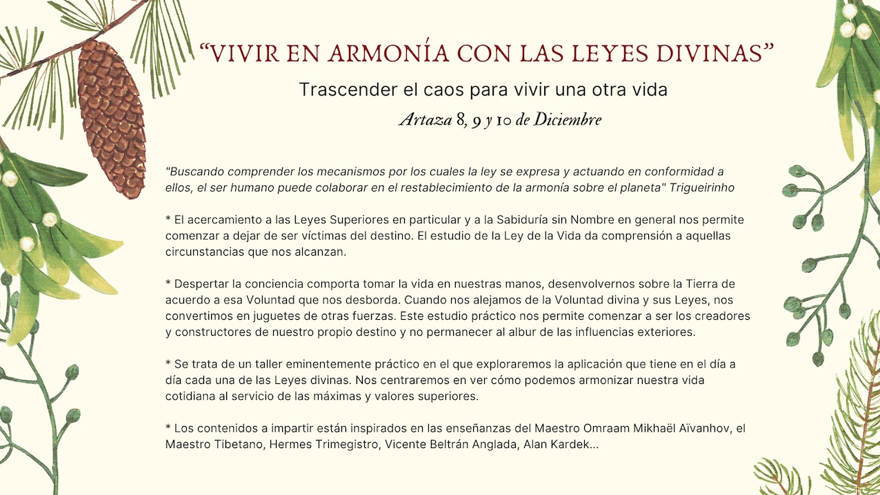 “Las Leyes divinas no se esconden en los libros, ni representan un conocimiento académico añadido, las Leyes divinas reposan en la naturaleza y rigen el último de nuestros átomos y la más lejana de las galaxias. Por eso nos queremos hacer con ellas, no con la intención de cargar aún más nuestra mente intelectual, sino por la voluntad de hacernos con la lógica superior que gobierna la Vida, que deseamos fundamente nuestra existencia. Las Leyes divinas son, operan, sea o no nuestro deseo. El universo mantiene un orden, una belleza, una solidaridad universal garantizadas por las Leyes. Si nos adherimos a ellas, si las guardamos, contribuimos a mantener la vida en su esplendor y armonía supremos. Estudiamos las leyes porque queremos ser Uno con el Universo y Su Fuente, porque nuestra contribución al presente y al mañana ha de ser fiel en esa observancia. Estudiamos las leyes porque tenemos vocación de solidaridad, porque creemos en un mundo feliz y sostenible por fin para tod@s.” K. A. |