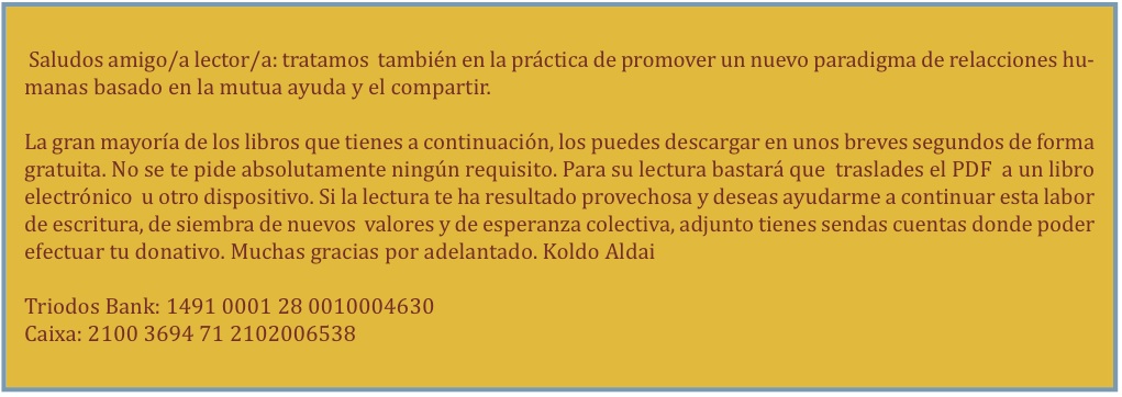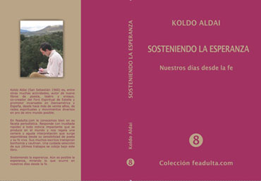 En él hallarás una selección de artículos escritos en los años 2008 y 2011. Aquí os van una líneas extractadas. " ... Sólo deseo enviar buena nueva allende estas cumbres, en todas las direcciones posibles. Sólo deseo llevar letras henchidas de esperanza y loas a Dios a los rincones de la tierra. Que un buen día tengamos un balcón, una atalaya al infinito para charlar con Dios... para decirLe con toda nuestra fuerza, con todo nuestro corazón que ya no sembraremos más batalla, que llegó la hora, que estamos por fin decididos a contribuir a Su cósmica armonía, a apuntalar Su orden supremo, a vivir como fieles hijos, por fin como hermanos en medio de este ancho y gozoso hogar otorgado, en medio de este jardín sobrecogedor, incomparable, por nombre Tierra. " Más información y adquisición en papel: http://www.feadulta.com/Ediciones_8_Koldo.htm El libro tiene más de 200 páginas y sólo cuesta 10 euros, gastos de envío incluidos. Para pedirlo a domicilio, basta escribir a info@feadulta.com y hacer la transferencia del importe de 10 euros. Descarga gratuita en PDF aquí: http://www.KoldoAldai.org/descargas/sosteniendolaesperanza.pdf |