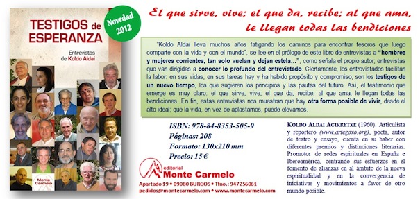 Gracias de corazón a Fundación Ananta (www.fundacionananta.org) que durante tantos años me pemitió salir, cuaderno en ristre, a tantos caminos, colocarme frente a frente de tantos seres excepcionales. Gracias a todos estos seres, a los que perseguí literalmente por todos los continentes, y que tuvieron a bien dejar un trozo de su alma metido en la grabadora y con ello sembrar su particular soplo de vida y de esperanza. Gracias por supuesto de corazón a los/as amigos/ as de la Editorial Monte Carmelo que han querido ordenar algunos de esos trabajos, empaquetarlos y ofrecerlos al mundo. Gracias siempre gracias... Podéis adquirirlo en: http://www.montecarmelo.com/testigos-esperanza-entrevistas-koldo-aldai-p-938.html
