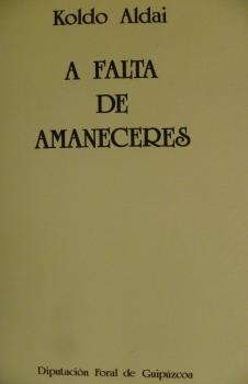 Con este libro gané el primer premio de un certamen de poesía que convocó la Diputación de Gipuzkoa en el año 1982. Concretamente lo convocó quien entonces era el Director General de Cultura, el gran bardo y poeta Xabier Lete. Con ocasión de la entrega de los premios y de alguna reunión anterior a la ceremonia tuve la suerte de conocerle. En el PDF sólo figuran algunos poemas sueltos. Descarga gratuita en PDF aquí: http://www.KoldoAldai.org/descargas/afaltadeamaneceres_Maquetacin1.pdf |